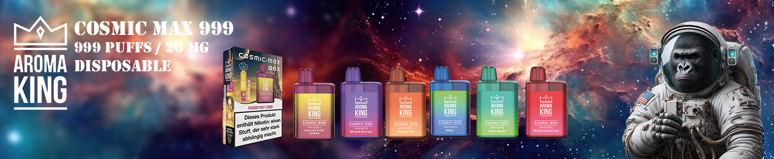 Aroma King Cosmic Max Box – 20 mg Test Package (9 Flavours)Das perfekte Bundle für alle, die aussergewöhnliche Geschmäcker und modernes Design lieben.Mit dem Aroma King Cosmic Max Box Testpackage erhältst du 9 einzigartige Flavours, die sich bewusst von klassischen Sorten abheben – intensiv, speziell und extrem beliebt.Inhalt des Test Packages:Watermelon IcePeach Kiwi HoneydewPassion Fruit LemonPomegranate Berry IceAloe GrapeSour AppleMintMango IceMixed BerriesProduktdetails:Bis zu ca. 700 Züge pro Gerät20 mg NikotinEinweggeräte (kein Aufladen, kein Nachfüllen nötig)Kompakt, stylisch und sofort einsatzbereitDie Cosmic Max Box steht für neue Geschmackserlebnisse – von exotisch-fruchtig bis erfrischend kühl. Dieses Test Package ist ideal, um die beliebtesten und speziellsten Sorten kennenzulernen oder einfach für maximale Abwechslung.Preisvorteil:Statt CHF 89.55 jetzt nur CHF 59.90 – attraktives Bundle mit starkem Rabatt!Fazit:Modern, intensiv und anders –das perfekte Set für alle, die mehr als Standard wollen.