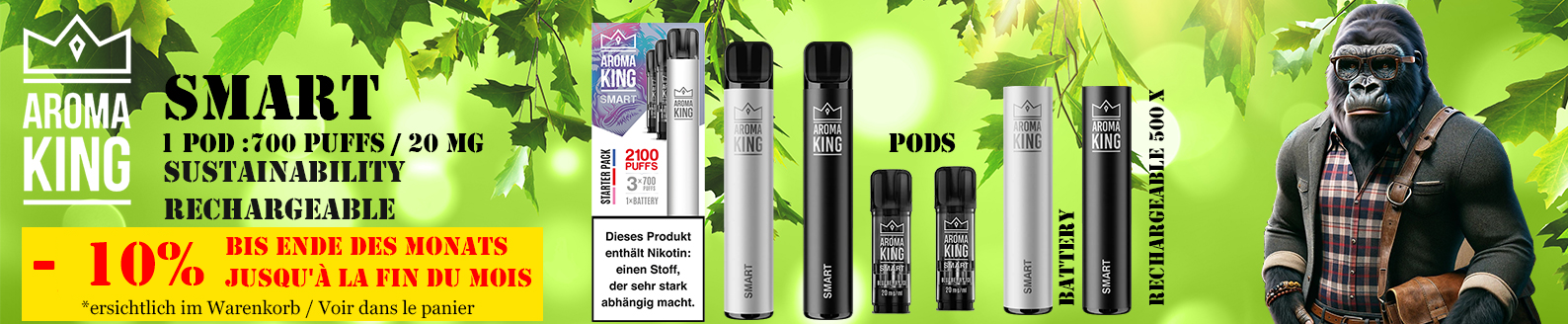 Entdecken Sie Aroma King SMART – Nachhaltiger Dampfgenuss mit Virgin Tobacco Geschmack!Aroma King SMART ist die Antwort auf eine umweltbewusste und zukunftsorientierte Art des Dampfens. Mit seinen herausragenden Eigenschaften setzt es Maßstäbe für nachhaltigen Genuss und Benutzerfreundlichkeit. Die wiederaufladbare Aroma King SMART Battery ist zudem kompatibel mit Pods von Elfbar, was Flexibilität und Komfort bietet.Geschmacksrichtung Virgin Tobacco: Virgin Tobacco überzeugt mit einem authentischen, milden Tabakaroma, das an klassische Virginia-Blends erinnert. Die leicht süßliche, runde Note sorgt für ein angenehm weiches und natürliches Geschmackserlebnis – ideal für alle, die ein traditionelles Tabakprofil bevorzugen. Dieses Aroma bietet ein klassisches, unkompliziertes Dampferlebnis, das auch langfristig nicht langweilig wird.Mit dem Aroma King SMART genießen Sie nicht nur ein herausragendes Dampferlebnis, sondern tun dies auch auf umweltfreundliche Weise. Machen Sie den Schritt zu nachhaltigem Dampfen und entdecken Sie die Zukunft des Genusses mit dem Aroma King SMART.Warum Aroma King SMART?Nachhaltigkeit: Wiederaufladbare Batterien minimieren Umweltauswirkungen.Weniger Abfall: Innovative Pods bieten 1400 Puffs pro Duo-Pack und 700 Puffs pro Einzelpod.Gesundheit: Schützt vor Feinstaub für unbeschwerten Dampfgenuss ohne Gesundheitsbedenken.Tauchen Sie ein in die Welt des nachhaltigen Dampfens und genießen Sie den intensiven Geschmack von Virgin Tobacco. Mit Aroma King SMART setzen Sie auf eine umweltfreundliche und zukunftsorientierte Lösung für Ihr Dampferlebnis.Jetzt entdecken und genießen – Aroma King SMART mit Virgin Tobacco!