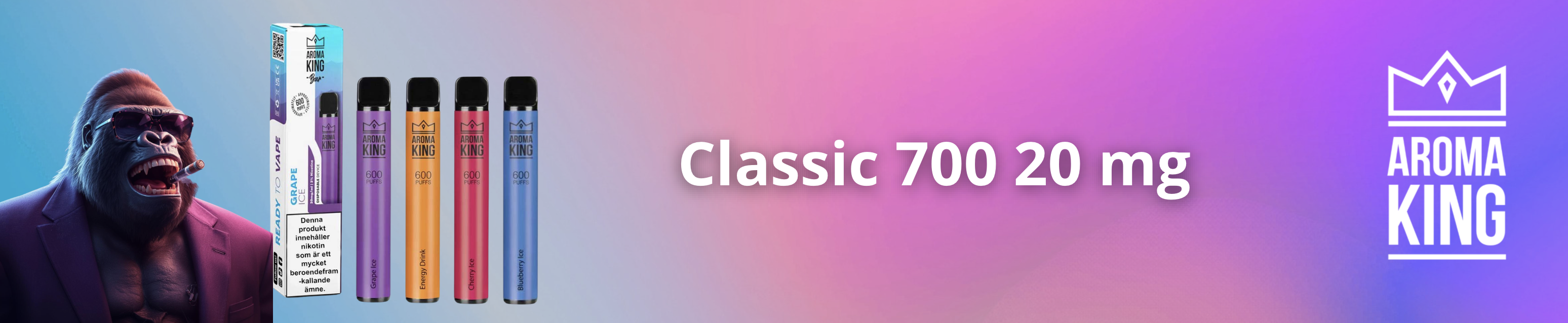 Aroma King Classic 700 – 20 mg Testpackage (10 Flavours + Lanyard)Das perfekte Set für alle, die Vielfalt erleben und ihre Lieblingssorte finden möchten.Mit dem Aroma King Classic 700 Testpackage erhalten Sie gleich 10 verschiedene Geschmacksrichtungen in einem praktischen Bundle – ideal zum Ausprobieren oder als Geschenk.Inhalt des Testpackages:Strawberry IceWatermelon IcePink LemonadeBlue Razz CherryPeach IceBanana IceCool MangoMixed BerryGreen AppleBlueberry IceLanyard (Umhängeband) für maximalen Komfort unterwegsProduktdetails:Bis zu 700 Züge pro Gerät20 mg NikotinEinweggeräte (kein Aufladen, kein Nachfüllen nötig)Sofort einsatzbereit – einfach auspacken und geniessenDieses Testpackage ist ideal für alle, die sich noch nicht auf einen Geschmack festlegen möchten oder einfach gerne Abwechslung haben. Die breite Auswahl von fruchtig-frisch bis süss sorgt dafür, dass für jeden Geschmack etwas dabei ist.Preisvorteil:Statt CHF 89.50 jetzt nur CHF 49.90 – Sie sparen über 40%!Fazit:Ein starkes Gesamtpaket für Einsteiger und Kenner –testen, entdecken und geniessen.